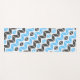 This yoga mat features a colorful geometric herringbone pattern in sky blue, dark gray, and white.