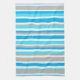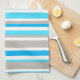 This colorful kitchen towel features a modern striped pattern in white, gray, and blue shades.