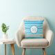 This modern square throw pillow features a colorful striped pattern in blue, gray, and white. Personalize it with a blue monogram in a round frame.