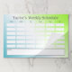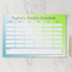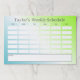 This tearaway weekly schedule template is divided into 6 rows and 6 columns (first is TIME, followed by days of the week MON to FRI), and a large rectangular shape for additional notes below. A simple, yet modern gradient background in blue, white, and green makes it perfect for students of all ages/genders.