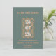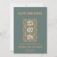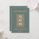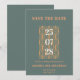 A modern wedding Save the Date featuring an stylish design and an elegant white and terracotta script. The exact color names are Cutty Sark (bluish grey) and Raw Sienna (terracotta).
