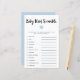Modern and simple boy baby shower baby word scramble card featuring a blue heart. The list of words on this card are all related to babies and they are scrambled. The guests are going to compete who can unscramble all of them first! ANSWER KEY: 1. car seat 2. milk 3. playpen 4. pacifier 5. diaper 6. rocking chair 7. nursery 8. baby monitor 9. swaddle 10. formula 11. rubber ducky 12. stroller.