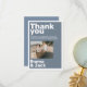 A modern minimalist wedding thank you design with a bold "Thank you" headline and clean typography. The dusty blue background and white text frame a favourite photo for a timeless, editorial look. Ideal for elegant celebrations, beach weddings, and contemporary couples. Simple, calm and stylish.