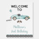Welcome your party guests with an adorable personalized sign. This adorable design features a blue watercolor race car with a flame detail.