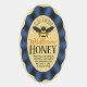 Modern blue ribbon border over a gold background featuring a bumble bee graphic at the center to create your own elegant honey jar stickers. Customize the text with the brand name of your beekeeping business, contact information, type of honey, weight, and date, Designed for oval and queenline honey jar containers, upside down squeeze bottles and quart mason jars.