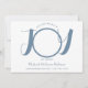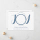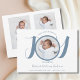 The front features the word joy in stylish blue script typography and your newborn's photo, full name, arrival date, and birth stats.