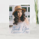 Modern photo graduation thank you card featuring the graduate's vertical photo with "thank you" in a handwritten blue calligraphy script overlay. Personalize the front of the graduation thank you card by adding the graduate's name and graduation year. The inside of the folded graduation thank you card features a trendy blue and white dotted geometric pattern on the left with your typed or handwritten message on the right.