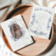 Celebrate your graduate with this modern and refined blue graduation photo announcement card. Featuring a stylish script overlay on a black and white photo, paired with delicate floral accents, this design creates a clean and timeless look.