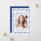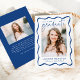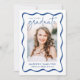 Celebrate your milestone with this Modern Blue Wavy Frame graduation announcement, designed to showcase your achievement in style. The front features a vertical graduate photo framed by a bold blue wavy border on a clean white background, with "Graduate" elegantly written in a handwritten blue script. Personalize it with your name, graduation year, and school for a unique and memorable touch. The back displays a horizontal photo with space for a custom message, perfect for sharing your appreciation or future plans. Ideal for high school and college graduates, this modern and sophisticated design is a keepsake your loved ones will cherish.