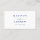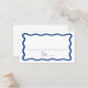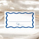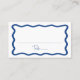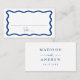 Add a stylish touch to your wedding reception or special event with these Modern Wavy Frame wedding place cards! The retro design displays "Table" in a handwritten blue script with space for you to write your guest's name and table number. A blue wavy border surrounds the design contrasting with a white background. The back of the flat place card features your names and wedding date in bold white lettering.