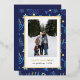 Celebrate Hanukkah in style with this modern photo card featuring a chic menorah and star pattern in timeless blue tones. Accented with real gold foil for a festive, elegant touch. The front showcases your favorite vertical family or couple photo in a clean white frame. The back includes space for two landscape photos and a personalized message—perfect for sharing your holiday blessings, light, and love with friends and family.