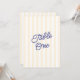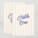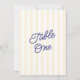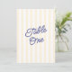 A fresh and modern wedding table number card featuring classic yellow stripes paired with a blue script. The bold striped background creates a clean, structured look while the handwritten typography adds a warm, relaxed touch.