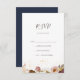 This modern blush floral | navy RSVP card is perfect for your elegant boho luxury rose gold, sage green, blush pink wedding. Design features a gold foil frame or bouquet with rustic red peach spring peony, a classic whimsical watercolor succulent flower, greenery including fern and eucalyptus, with appearances of a vintage dusty rose and ivory butterfly. Other flowers include hydrangea, dahlia, and rose. The design is ideal for a classy, creative botanical fall, spring, summer, winter, retro bohemian wedding. Please feel free to contact us with any questions regarding the product's design; cheers!