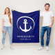 A modern nautical-themed custom blanket for your boat that features a white illustration of an anchor in a circle on a navy blue background. Personalize with your boat's name and location in simple white typography.