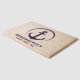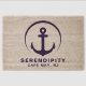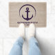 A modern nautical-themed doormat for your boat that features a navy blue illustration of an anchor in a circle and your boat's name and location in simple typography.