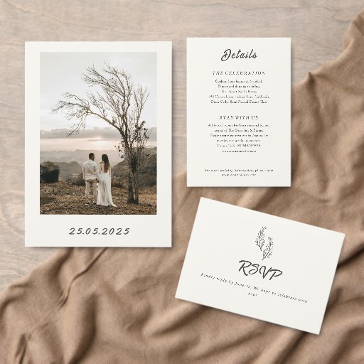 Designed for the couple who appreciates organic textures and clean minimalism, this card uses a sophisticated balance of flowing script and spacious sans-serif fonts. It is a stunning choice for desert destination weddings, outdoor boho-chic ceremonies, or any event where "less is more."