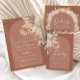 Modern bohemian terracotta pampas grass stylish wedding invitation card. Beautiful handprinted floral watercolors and script text. Modern on trend design.