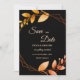 Announce your upcoming wedding in style with our Elegant Autumn Botanical Gold Frame Save the Date card. This design features a striking black background, accentuated by warm apricot-colored fonts that create a vivid and inviting look. Delicate leaves in shades of soft muted earth tones and earthy autumnal copper shades add a cozy and romantic autumnal feel, while the geometric frame, blending burnt orange and terracotta hues, lends a rustic yet elegant touch. Perfect for autumn, fall, or winter celebrations, this save the date card captures the botanical charm and modern minimalism of a love-filled union. Ideal for couples seeking a romantic and sophisticated way to share their special day, this card radiates warmth and elegance, ensuring your guests mark their calendars for a wedding to remember.