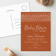 Whether you can't gather for a party due to coronavirus social distancing guidelines, or long distance family and friends are just too far away, this trendy boho Baby Shower by Mail invitation will allow loved ones to celebrate your new baby from anywhere. The design features a cool mud cloth inspired tribal border with modern minimalist typography. Shown on a gender neutral terra cotta rust background or use the design tools to customize in any colors for baby boy or baby girl. Add your virtual baby shower details or customize to suit your event.