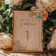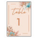A modern and elegant boho wedding table number card, designed with blue and earthy brown watercolor florals, and script lettering.