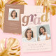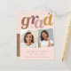 A modern boho photo graduation announcement postcard featuring "grad" at the top in terracotta, mauve, dusty rose, and mustard hues placed on top of a blush pink background. There are two photos placed slightly tilted for you to easily replace with your own! The backside features another photo and more details about your graduate.