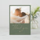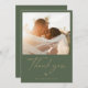 Modern boho script photo, moss green wedding thank you card. Features, single photo space on front, taupe color graphic "Thank You", heart accent, template text lines for your names and personalized message.