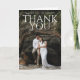 This modern and bold thank you card features a large thank you message on top of a photo background. The couple's names are displayed above the thank you message and the inside is blank to handwrite a personalized thank you message.