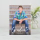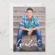 Modern Brush Stroke Script Photo Graduation Announcement featuring your photo and our bold script overlay in white The back is a modern light blue / dusty blue, but all fonts and colors are easily modified. Perfect for celebrating your graduate! Very modern and perfect for a masculine boy graduation. Please contact us at cedarandstring@gmail.com if you need assistance with the design or matching products.