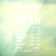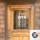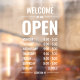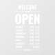 A modern window cling to display a greeting and your stores opening hours to customers, clients and visitors. The simple modern design shows the greeting "Welcome", "We are open" with "open" in bold capital letters. It also includes a list of your stores opening days and hours. Below the opening hours the design shows a call to action saying "come on in". Ideal for stores, shops, offices and any other business which serves customers.