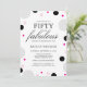 This modern and sleek invitation combines elegant script font and minimal typography on a custom photo of the birthday girl to celebrate 50 and fabulous in the best way ever. A combination of grey, pink and black polka dots can be rearranged on the page to accomodate any text. Contact the designer for more design customization options.
