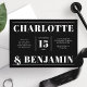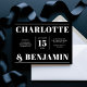 Plain white envelopes are included with paper invitations and will come to fit the invitation size you select. If you don’t need the envelopes, you may choose to not receive them by selecting the dropdown below "Envelopes" and choosing "None." If you’d like to have a design on your envelopes, you can browse all of these available envelopes to find the design that complements your Modern Bold White And Black Horizontal Wedding Invitation.