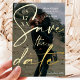 A modern and simple bold script in white on black overlay save the date wedding with real gold foil, add your photo.
