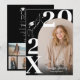 Confident, minimal, and fashion-forward — this modern graduation party design makes a statement with oversized typography and a clean editorial layout. The dramatic stacked year numerals create instant impact, while the soft arched photo frame adds warmth and balance. The reverse side features a structured party layout with a curated photo collage, blending bold serif headlines with elegant script for a polished yet contemporary look. It feels elevated and stylish — perfect for seniors who love modern branding, neutral tones, and a magazine-inspired aesthetic.