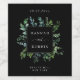 Elegant watercolor greenery, black wedding wine bottle label. Label features modern watercolor botanical foliage frame. Template text lines for date, names and location.