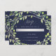 This elegant wedding response card features a modern, silver look geometric frame with a trendy green leaf-filled wreath on a midnight blue background.