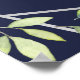 This elegant wedding seating chart features a modern, silver look geometric frame with a trendy green leaf-filled wreath on a midnight blue background.