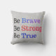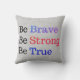 Be Brave, Be Strong, Be True - motivational quote in modern black, blue, red font typography on gray faux burlap background