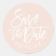 Set the tone for your celebration with this round modern blush save the date sticker featuring flowing white brushed script over a soft blush pink background. The relaxed calligraphy pairs beautifully with a clean dot-separated date format for an effortlessly chic look. Use these stickers to seal your save the date envelopes or add a personalized finishing touch to mailings. All text is fully customizable to match your wedding details.