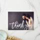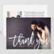 Stylish wedding flat thank you note card template features a rustic brushed script "thank you" overlay design with modern monogram and a landscape photo of the bride and groom on the front side. Includes a second portrait photo and black custom thank you message text that can be personalized on the back of the card.