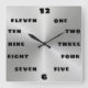This trendy custom acrylic wall clock features words spelling out ten of the twelve numbers on the face over faux brushed steel background. Great gift idea for modern home or office decor.