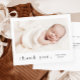 A simple photo baby thank you card featuring a modern name and photo on the front. The back has a large full name header and personal message from the family. Click the edit button to customize this design with your photos and details.
