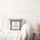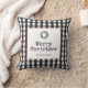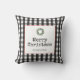 This Christmas throw pillow features modern black typewriter text "Merry Christmas" on a black and white plaid background. The design is accented with a holiday wreath. Personalize this trendy style with your family name.