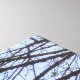 The image features a tall, modern building with a glass facade, viewed from a low angle. The building's windows reflect the sky, creating a blue and purple hue. Bare tree branches frame the building, adding a natural element to the urban scene. The sky is light blue with some clouds visible. The overall mood is serene and contemplative, highlighting the contrast between nature and architecture.