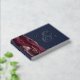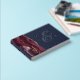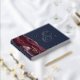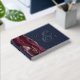 This elegant wedding guest book features a burgundy watercolor agate design trimmed with faux gold glitter. Easily customize the real gold foil text on a navy blue background, with the names of the couple in whimsical handwriting calligraphy over a large ampersand. Add additional text of your choice to the front and spine.