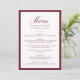 This wedding menu showcases “Menu” in rich burgundy calligraphy, with coordinating serif text for the couple’s names, wedding date, and menu selections. The burgundy border adds warmth and a sense of classic romance, creating an elegant presentation well-suited for formal and evening receptions. The combination of the deep burgundy color and traditional typography gives the design a refined, finished feel.
