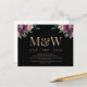 Modern Burgundy Floral Black Gold Monogram Wedding Invitation Postcard. Modern typography with couple's initials in elegant antique gold colored text on midnight black adorned with digitally adjusted hand painted watercolour flowers and leaves in rich burgundy, maroon, marsala, blush, coral, pinks, greens, and blue grays printed on midnight black. Ivory white postcard back with space for a handy written note. Personalise with your wedding information. We invite you to visit our Zazzle store, Austen & Grace, to view the full wedding suite, matching products and more.