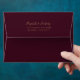 The inside of this elegant modern wedding invitation envelope features a burgundy watercolor agate design trimmed with faux gold glitter. Customize the back flap with the names of the bride and groom in gold-colored handwriting script and return address in copperplate font on a burgundy red background.
