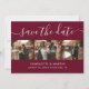 Custom modern burgundy wedding photo collage save the date cards featuring 4 images and a modern script font. Easily personalize this stylish photo wedding save the date with your images and wedding details including a wedding website. Matching items available.
