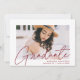 Invite guests to celebrate the graduation with our modern photo graduation party invites. The trendy graduation party invites feature the graduate's photo with "Graduate" in a burgundy modern calligraphy script overlay. Personalize the front of the invites by adding the graduate's name, school name, and graduation year. The invite reverses to display your graduation party details and a trendy burgundy and white dotted geometric pattern.