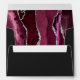 The inside of this elegant modern wedding invitation envelope features a burgundy watercolor agate geode design trimmed with faux silver glitter. Customize the back flap with the names of the bride and groom in silver gray text on an off-black background.